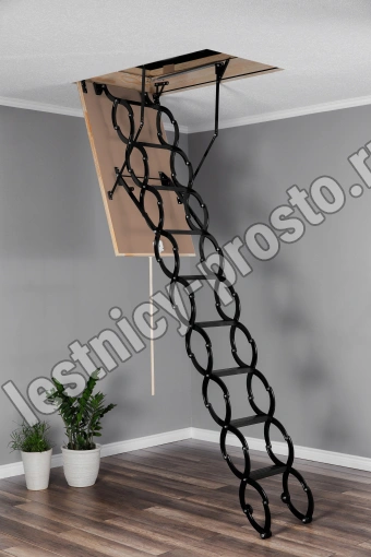 Лестница чердачная раздвижная ножничного типа, работает по принципу сжатия. Термоизоляционная крышка типа“сэндвич “, толщиной 26мм, утеплена пенопластом , облицована с двух сторон ДВП древесного цвета. Лестница предназначена для условий, когда чердак утеплен и не требует дополнительной теплоизоляции. Короб деревянный высотой 140мм. по периметру проходит уплотнитель.