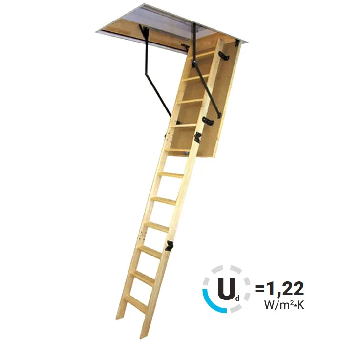 Лестница складная трёхсекционная, изготовлена из сосны. Термоизоляционная крышка типа "сэндвич" утеплена пенопластом, облицована с двух сторон ДСП белого цвета. Короб люка с однослойным уплотнителем. Все металлические элементы лестницы покрыты порошковой краской, ступени лестницы имеют антискользящие насечки и закреплены в столярное соединение «ласточкин хвост», что позволяет выдерживать нагрузку  до 150 кг. Деревянный стержень для открывания лестницы в комплекте.
