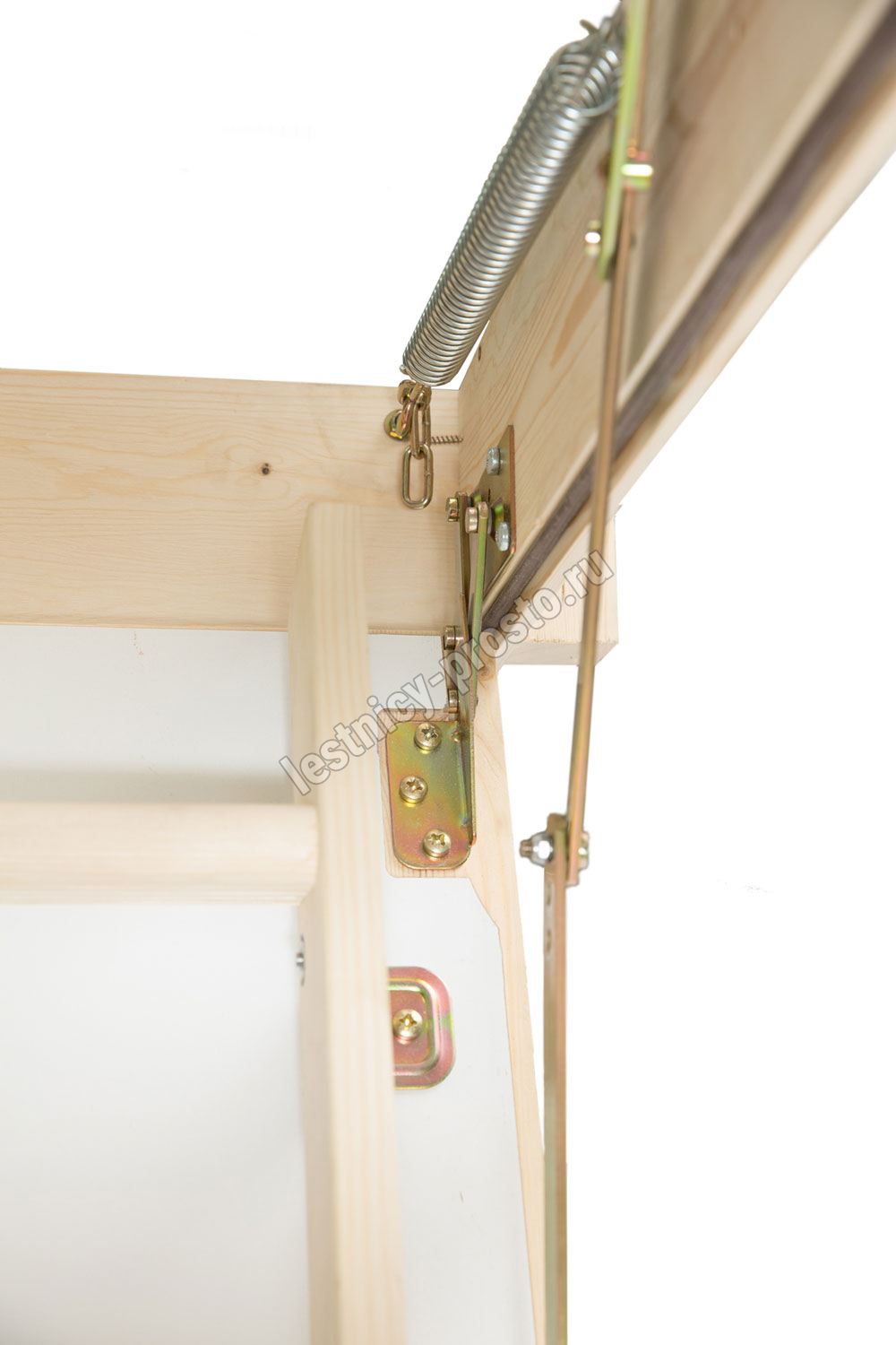 В комплекте: люк из сэндвич-панели, пружинный механизм "короб-рычаг", короб, четырехсекционная лестница с буковыми ступенями, замок люка, штанга для раскладывания лестницы, наконечники для ножек