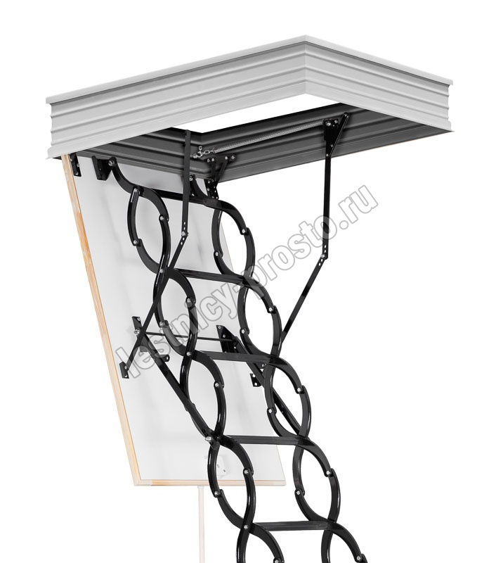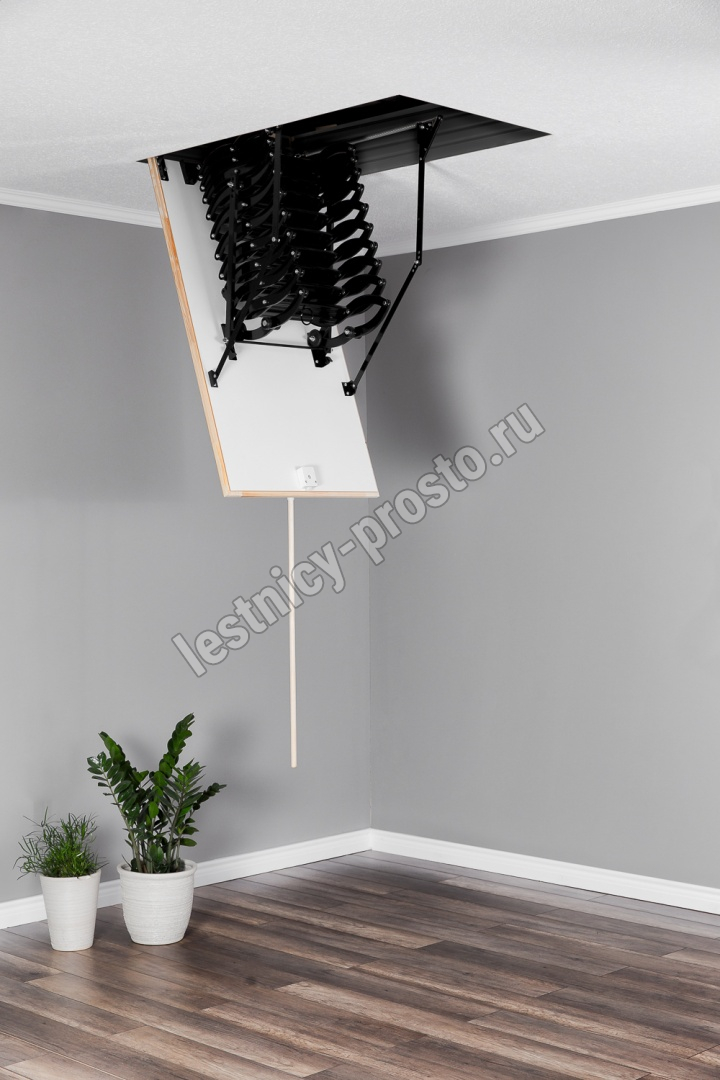 Все элементы лестницы выполнены из экологически чистых материалов и обработаны веществами, не содержащими тяжелых металлов. На ступенях антискользящие насечки. Короб лестницы изготовлен из металла. Термоизоляционная крышка типа "сэндвич" утеплена пенопластом, облицована с двух сторон ДСП белого цвета. Короб люка с уплотнителем. В комплекте деревянный стержень для открывания лестницы.
