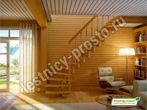Современная лестница с "воздушным" дизайном. Смотрится легко и благородно, благодаря конструкции на больцах. Хороша при установке к стене, компактна.