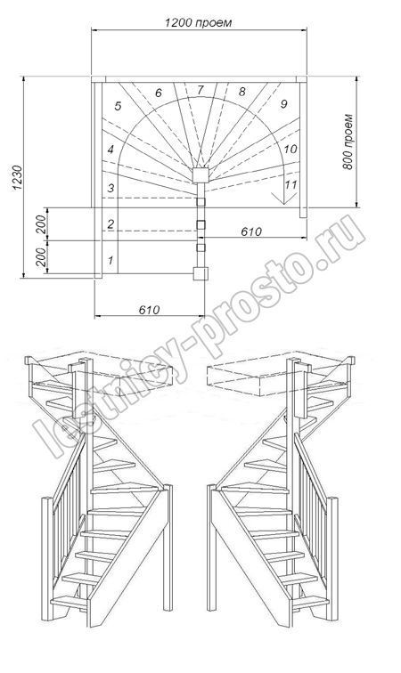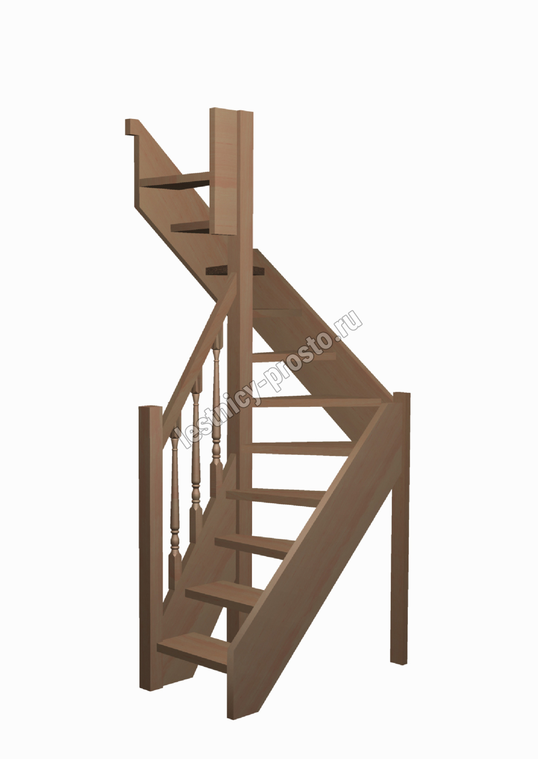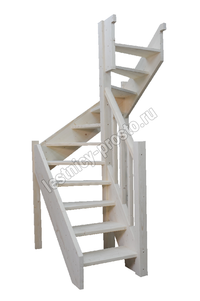 Компактная лестница из дерева. Удобный подъем засчет забежных ступеней и ограждений, которые входят в стандартную комплектацию. В стандартной комплектации столбы квадратные, балясины точёные. Элементы лестницы и ограждения поставляются в разобранном виде без какого-либо покрытия.