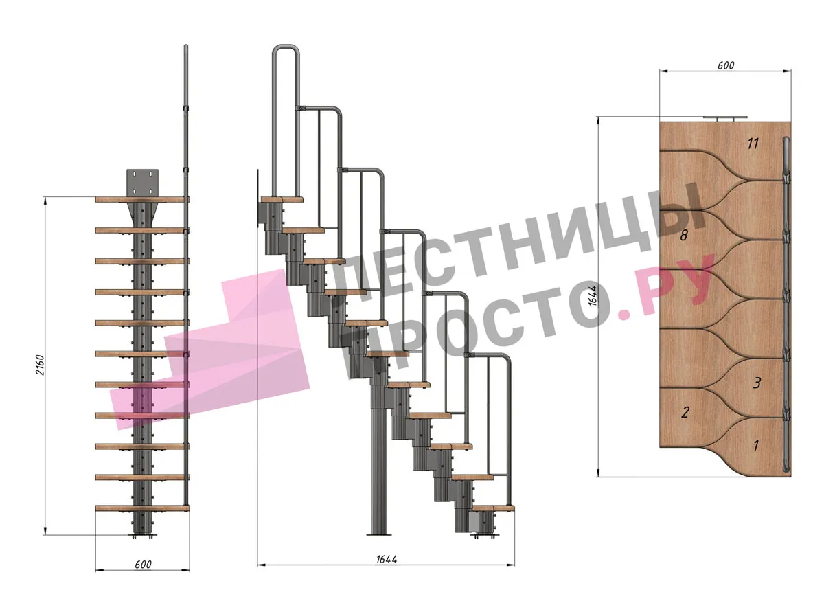 Лестница Prosto Urban Black гусиный шаг 600 мм, h198-288 см (11 ступеней), бук