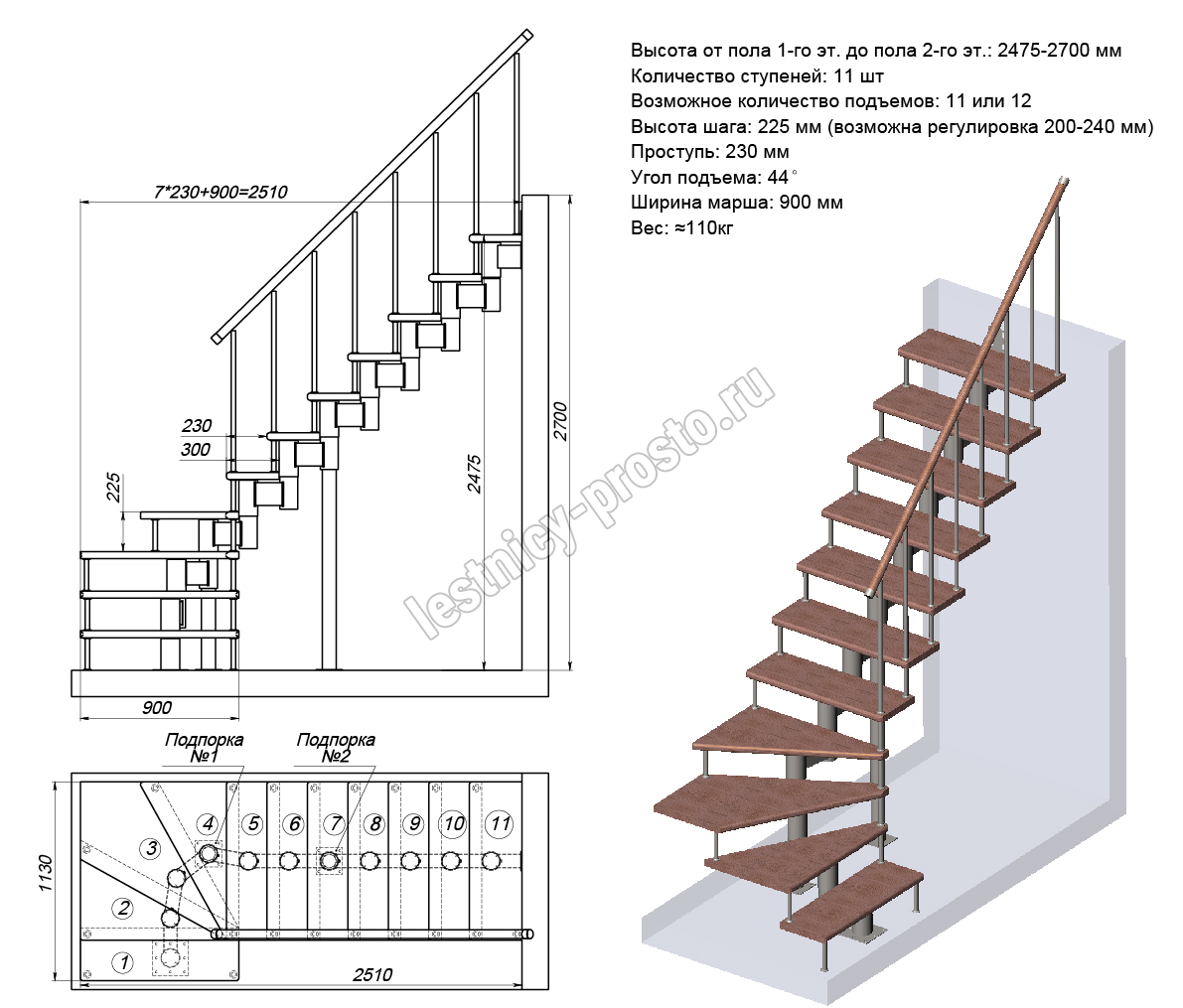 Количество ступеней до поворота - может быть любым , по запросу мы рассчитаем стоимость и сделаем чертеж-схему в соответствии с вашими параметрами.