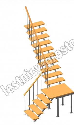 Металлокаркас покрыт порошковой краской. В зависимости от дизайна лестницы, металлокаркас может оставаться видимым или полностью обшиваться. Лестница на базе каркаса может собираться как в левозаходном, так и в правозаходном вариантах. Монтаж рекомендуется осуществлять силами двух человек на объекте, по указаниям, приведенным в паспорте.