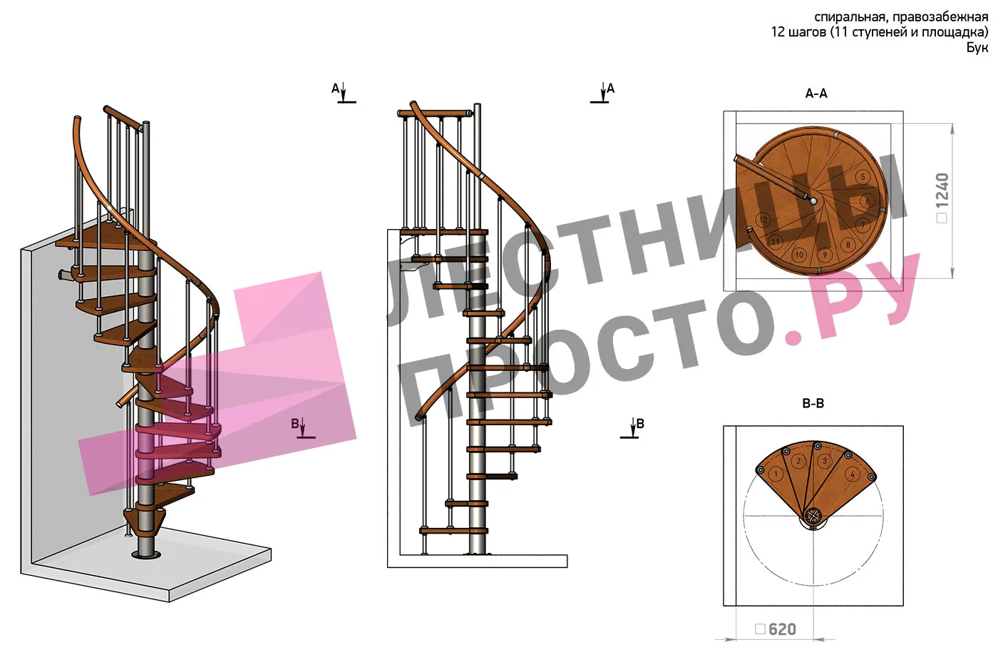 Решение о направлении поворота принимается при сборке - универсальная конструкция позволяет собрать правозабежную и левозабежную лестницы. Высота ступеней регулируется с шагом 3 мм. в пределах 217-247 мм., благодаря чему, лестница прекрасно подгоняется под необходимую высоту.
