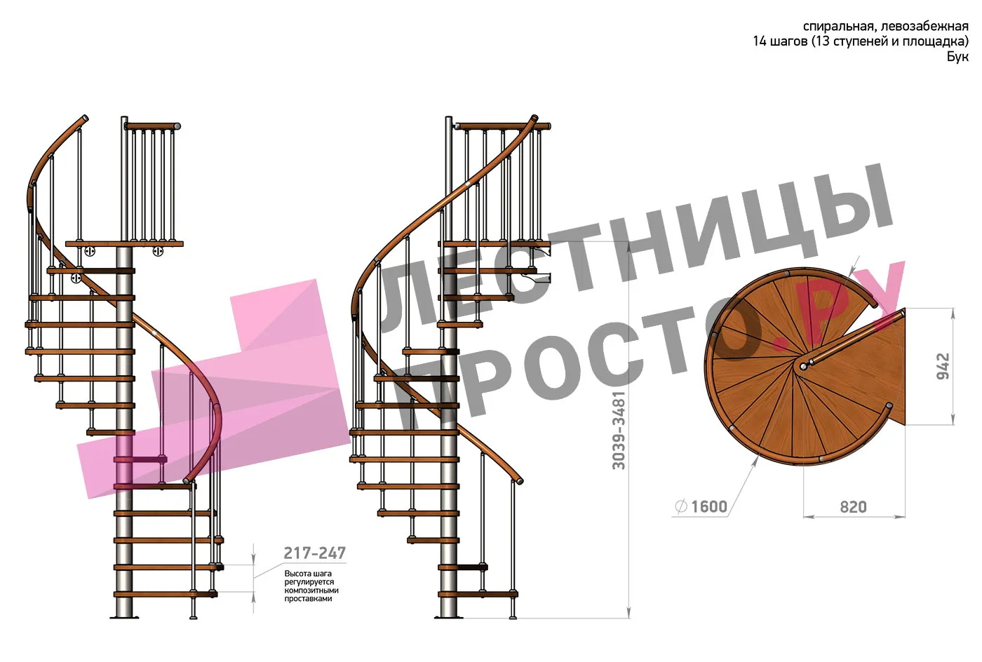 Ширина ступени между центральной колонной и поручнем ≈ 680 мм
