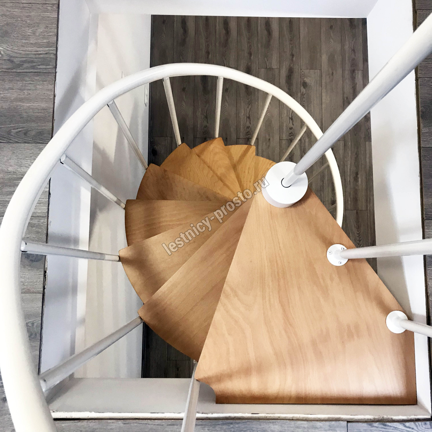 Ступени лестницы изготовлены из бука по технологии MULTIPLEX и покрыты износостойким защитным лаком. Лестница монтируется как по часовой стрелке, так и против. Возможен монтаж в круглый или квадратный проём. Ограждение: стальные трубки, Ø25 мм RAL 9016. Поручень: гибкий цельный ПВХ-поручень Ø40 мм белого цвета. Конструкция и балюстрада окрашены порошковым способом в белый цвет (RAL 9016).