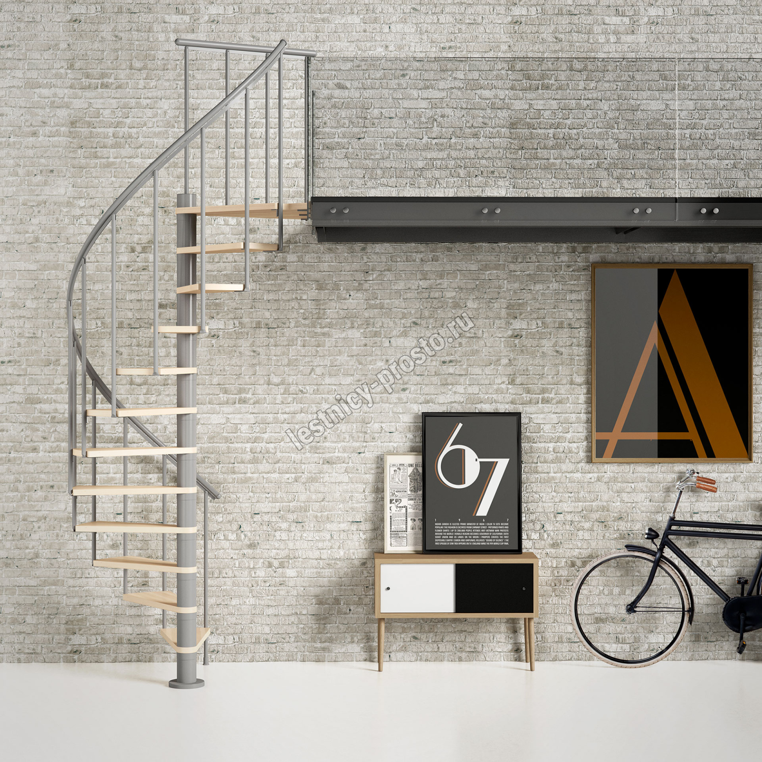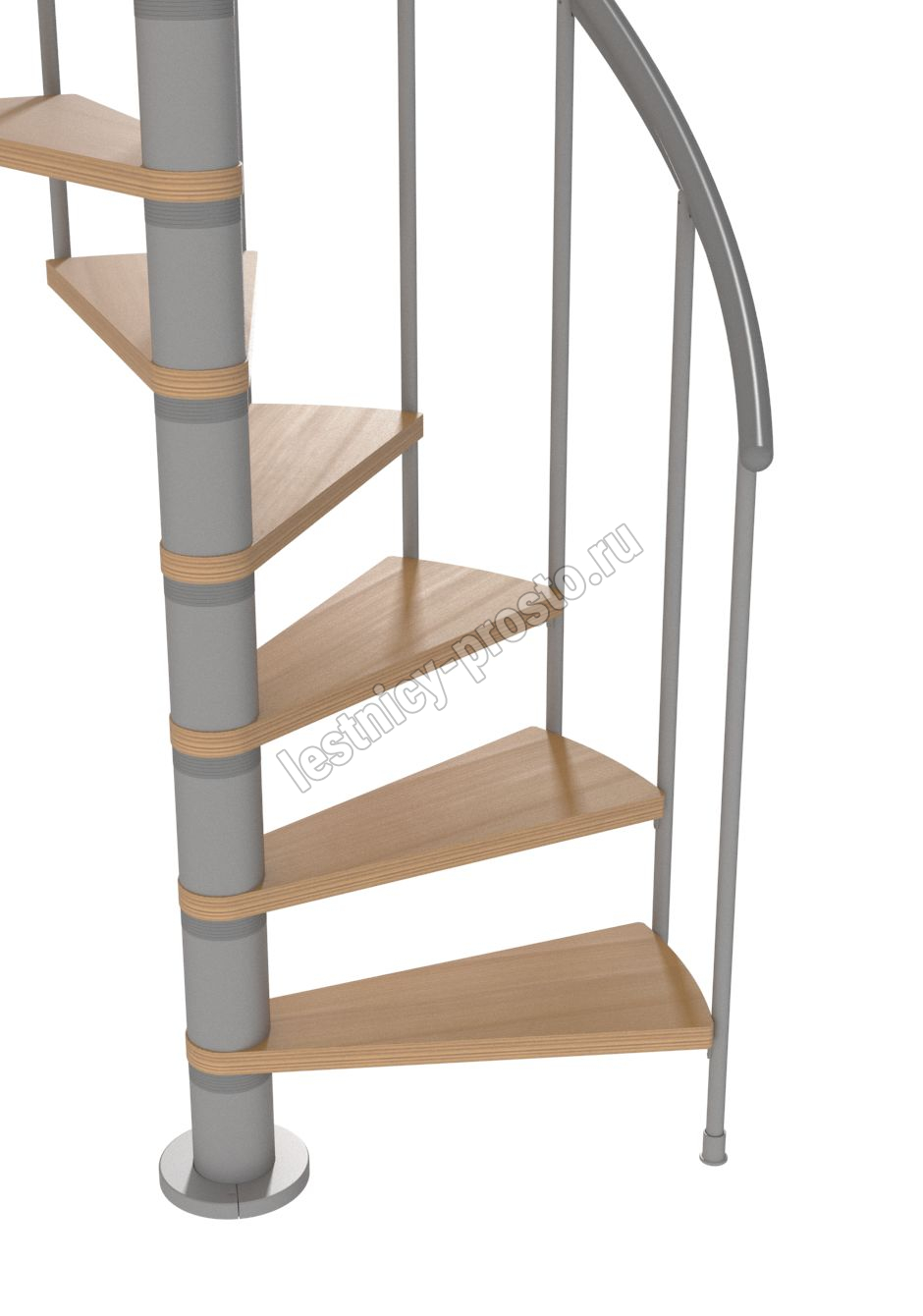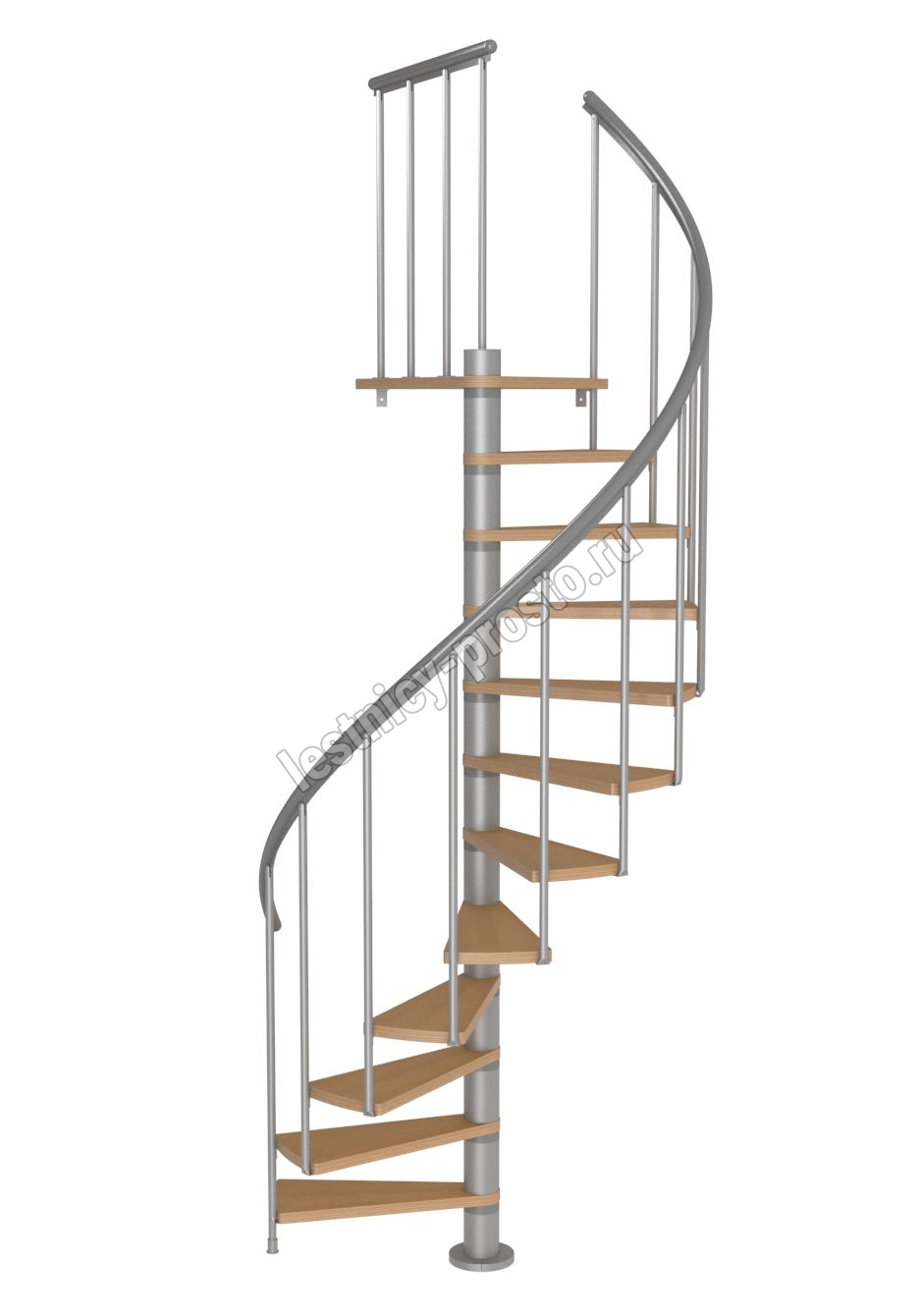 Ступени лестницы изготовлены из бука по технологии MULTIPLEX и покрыты износостойким защитным лаком. Лестница монтируется как по часовой стрелке, так и против. Возможен монтаж в круглый или квадратный проём. Ограждение: стальные трубки, Ø25 мм RAL 9006. Поручень: гибкий цельный ПВХ-поручень Ø40 мм серого цвета. Конструкция и балюстрада окрашены порошковым способом в серый цвет (RAL 9006).